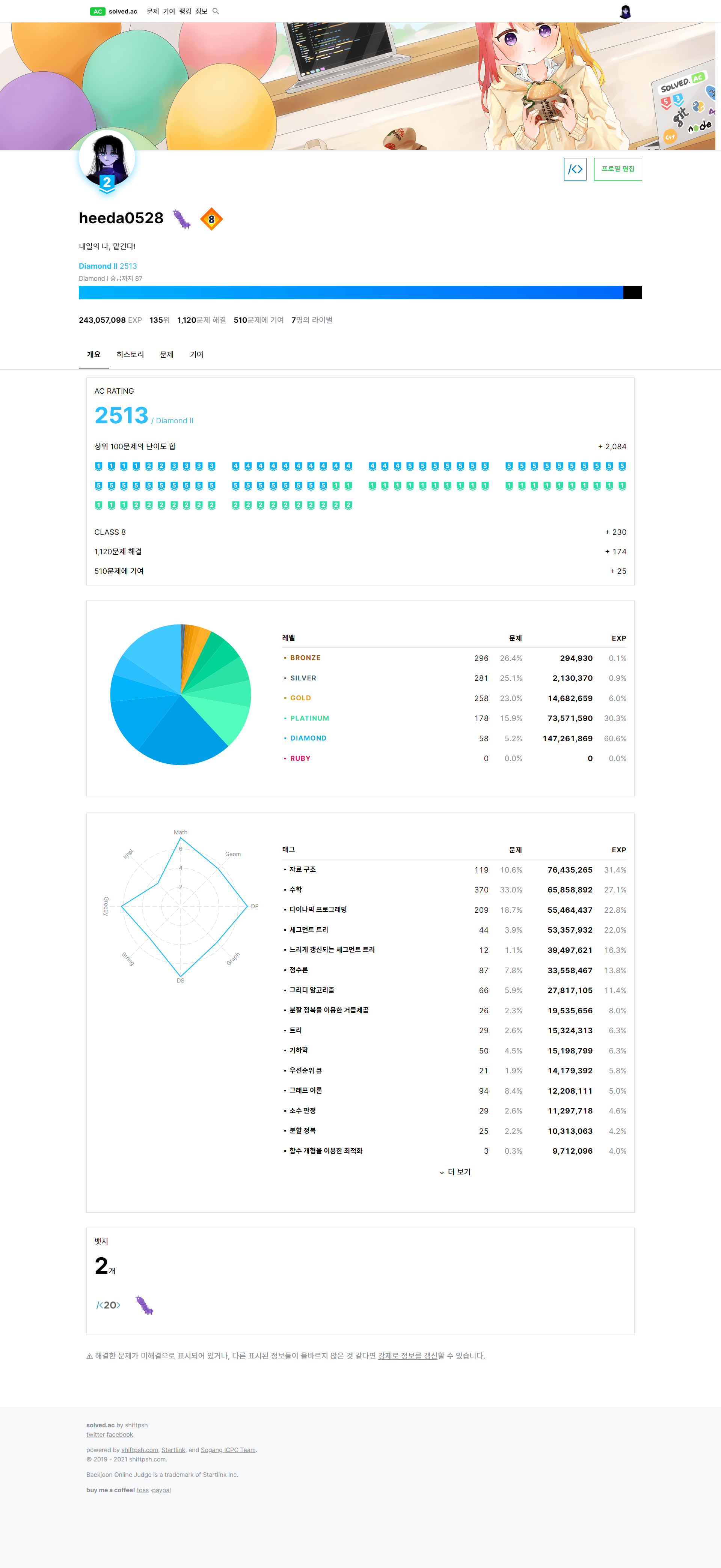 그리고 세그 비츠 덕분에 자료구조 경험치가 떡!상해서 solved.ac 시작 이후 처음으로 수학 태그가 경험치 2등의 자리로 내려왔다. 수학은 나의 상징이자 자존심이었는데 자료구조한테 진걸 보자니 조금 속상했다... 조만간 날 잡고 수학 셋을 밀어야겠다.