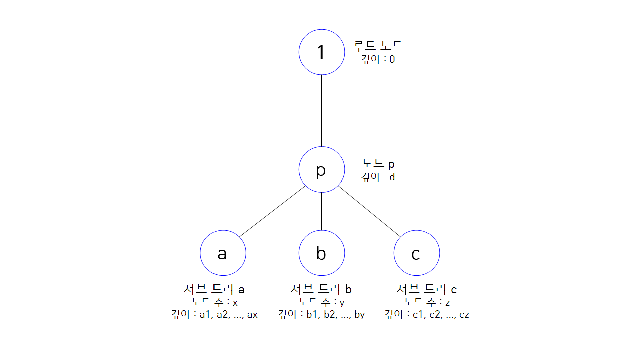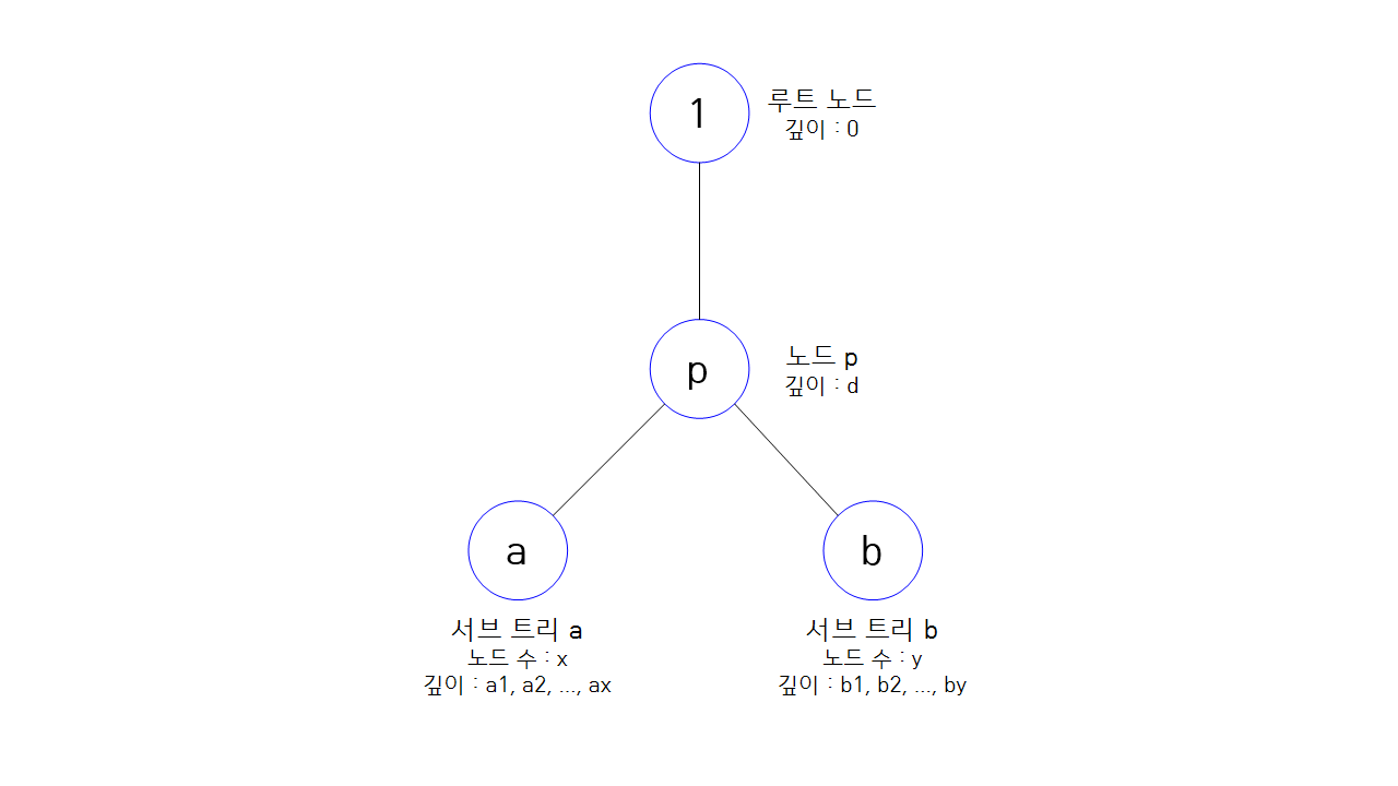 깊이가 $d$인 노드 $p$를 루트 노드로 하는 서브 트리의 답을 계산할 것이다. 이때 서브 트리 $a$에는 깊이가 각각 $a_{1},a_{2}, \cdots , a_{x}$ 인 노드 $x$개가 있고, 서브 트리 $b$에는 깊이가 각각 $b_{1},b_{2}, \cdots , b_{y}$ 인 노드 $y$개가 있다.